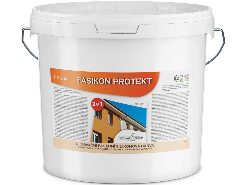 FASIKON PROTEKT je renovační silikonová fasádní barva s výztužnými mikrovlákny a enkapsulovanými biocidy. FASIKON PROTEKT je určen k použití v exteriéru, případně interiéru, a slouží k nátěrům minerálních podkladů, vápenných, vápenocementových, břízolitových a sádrových omítek, zdiva apod. FASIKON PROTEKT je možné použít pro nové i renovační nátěry fasád, akrylátových i silikonových fasádních barev a také dekorativních omítek zateplovacích systémů (ETICS). FASIKON PROTEKT je vhodný pro renovaci fasád historických objektů i jako egalizační nátěr minerálních, silikátových omítek. Výztužná mikrovlákna napomáhají k přemosťování nedynamických trhlin. Enkapsulované biocidy výrazně zlepšují odolnost nátěrového filmu proti biotickému napadení (TP7), jako jsou řasy. Fasádní nátěr je tak lépe a déle chráněn proti řasám a plísním než u běžných fasádních barev. Renovační silikonová fasádní barva FASIKON PROTEKT je charakteristická vysokou paropropustností pro vodní páry, výraznou samočistící schopností nátěrového filmu s dlouhou životností i za ztížených klimatických podmínek.