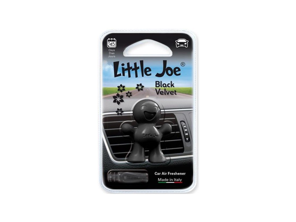 Osvěžovač vzduchu Little Joe, ve tvaru veselého 3D panáčka, vyrábí Švýcarská firma Supair Drive AG z polymerů s obsahem parfému 25% tak, aby voněl akorát a přitom nedráždil, tato unikátní technologie zajišťuje rovnoměrné uvolňování parfému do prostoru po dobu nejméně 45 dní, díky spolupráci s parfuméry renomovaných značek Givaudan a Firmenich zajišťují nejvyšší jakost a vybrané vůně pro Váš vůz, BLACK VELVET - výrazná, kořeněná, ovocná vůně citronu, bergamotu a francouzské levandule, jedná se především o pánskou vůni s jemnými podtóny tonkového koření a madagaskarské vanilky spolu s pryskyřicí, na její příjemné intenzitě a podkreslení se podepsalo také indonéské santalové dřevo, kadidlo a pižmo, jedná se o osvěžovač, který by mohl konkurovat jakékoliv pánské voňavce, postavičku lze připevnit do mřížky ventilace automobilu, vůní lze samozřejmě využít i jinde než v autě např. může provonět Váš pokoj, kancelář či sportovní tašku, rozměry panáčka 5 x 4 x 2,5 cm.