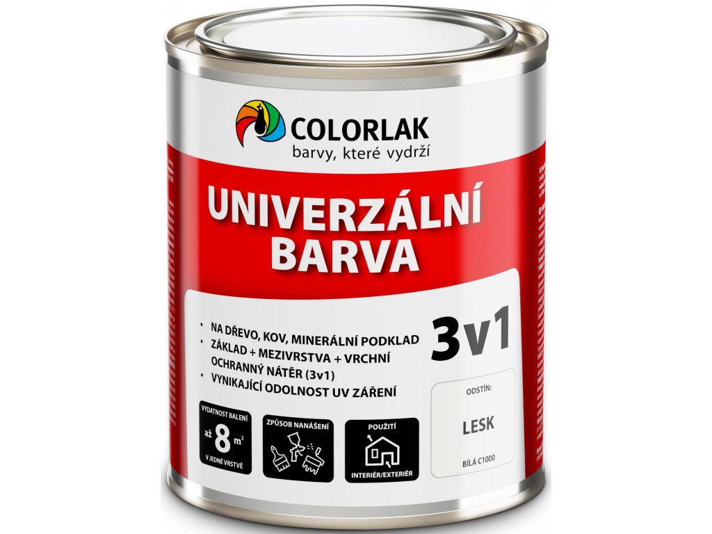- Lesklá UNIVERZÁLNÍ BARVA 3v1 S2130 slouží jako jednovrstvá barva pro venkovní i vnitřní nátěry na dřevo, kov (mimo pozink a lehké kovy), jako jsou např. dřevěná okna, dveře, ploty, zahradní nábytek, chaty, zahradní stavby, různé kovové konstrukce, oplocení, vrata, okapy, parapety, zábradlí, zárubně apod. Barva má vynikající odolnost na povětrnosti a vysoký lesk.